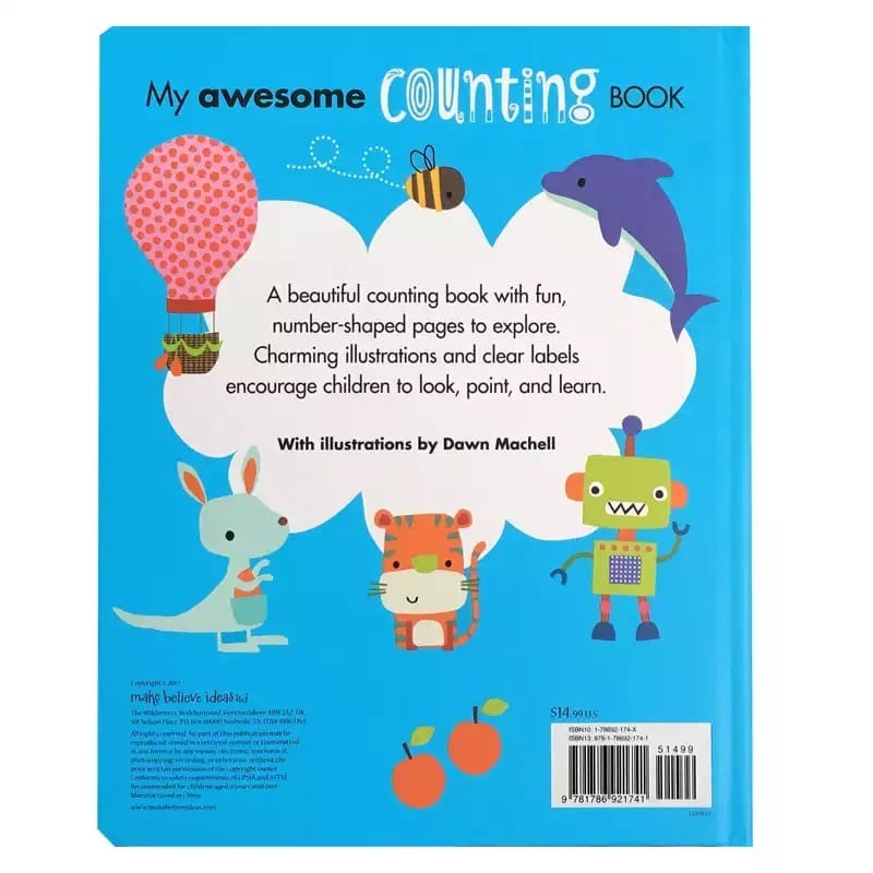 My Awesome Counting Book is a fantastic way to introduce children to counting and numbers. Each page is filled with numbers, pictures and counting activities for children to complete. Clear labels and fun sentences accompany Dawn Machell’s cute illustrations, making this book perfect for adults and children to enjoy together. Each number is presented with a die-cut page in the shape of that number, so children can explore the figures with their hands!